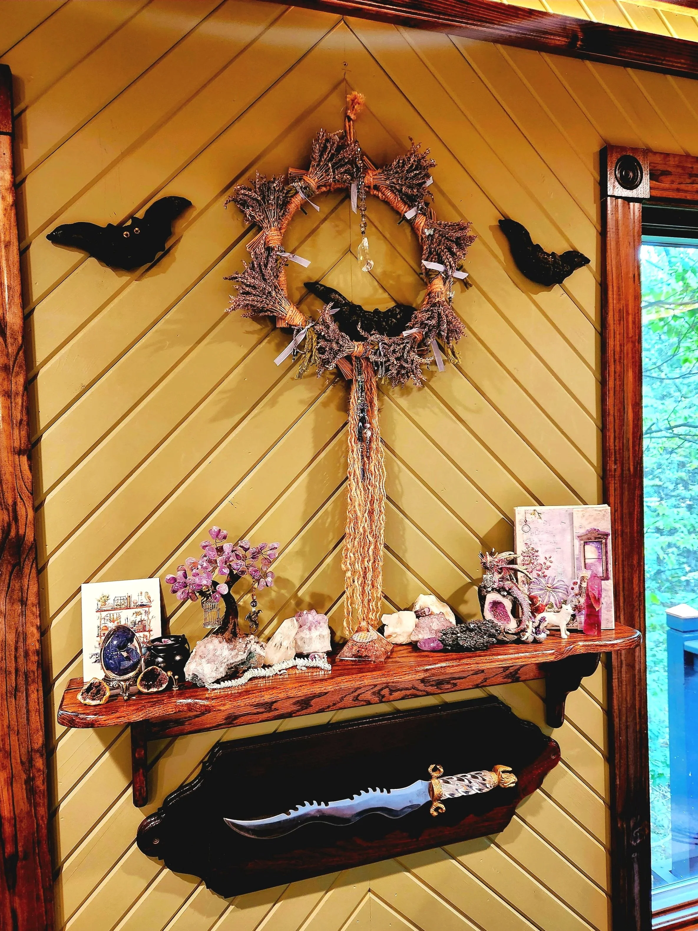 Blown glass ornaments combine to create a glass-beaded wall hanging. Majestic Glass was featured at the St Louis Renaissance Festival 2021. Artist Catherine Daniels has contributed multiple pieces to the treehouse.
